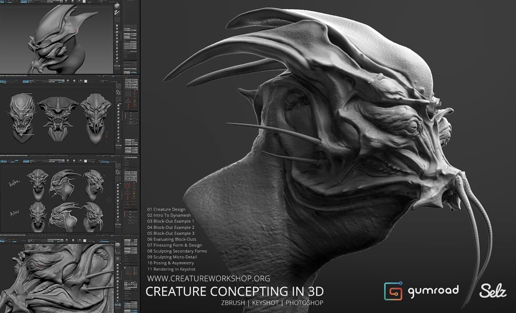 Design 3 creature busts in ZBrush using block-out techniques. Review them and pick 1 design to take to final sculpt and presentation. Paypal available on gumroad.